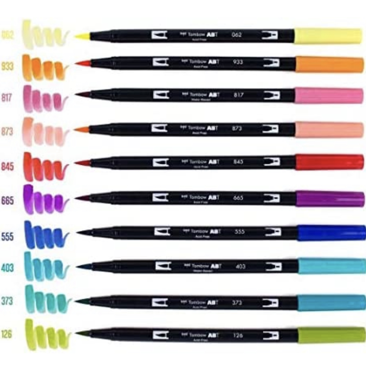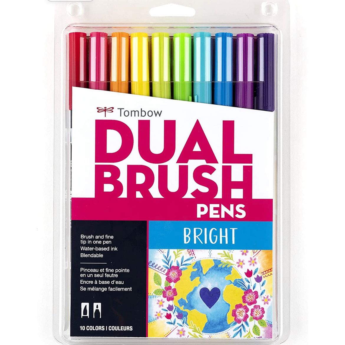 These dual brush pens have a versatile and flexible nylon fiber brush tip on 1 end that creates medium or bold strokes by simply changing brush pressure. The fine tip on the other end is for smooth straight lines or writing. The resilient nylon brush retains its point, stroke after stroke. The ink is water-based and blendable: use 2 colors together, or use the colorless blender pen. The pen tips self-clean after blending so there is no messy clean-up! Use these pens for coloring, rubber stamping, hand-lettering, doodling, journaling, and more. Perfect for fine art techniques. The ink is acid-free, non-toxic, odorless, and non-bleeding. Each package contains 10 pens (9 colored, 1 colorless). Available in a variety of color schemes, each sold separately. Features & details Ideal for fine art, brush lettering, faux calligraphy, illustrations, water color illustrations, journaling and more! Durable nylon brush tip can create fine, medium or bold strokes Fine tip gives consistent lines Included colorless blender pen softens and blends colors, creating a watercolor effect The water-based ink is non-toxic, blend able, non-bleeding, and odorless Tips self-clean after blending Ideal for professional fine art and crafts
